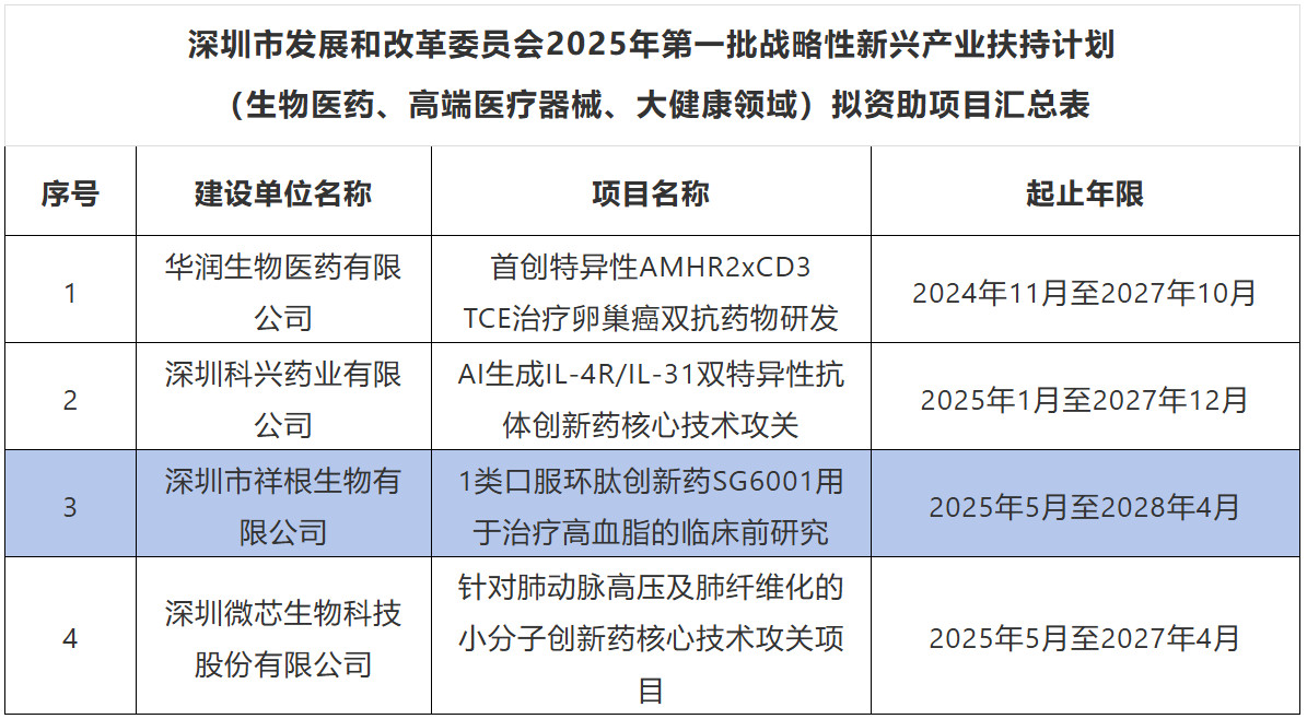 【公司喜讯】祥根生物口服环肽创新药项目SG6001被纳入深圳市战略性新兴产业扶持计划(核心技术攻关扶持专项)